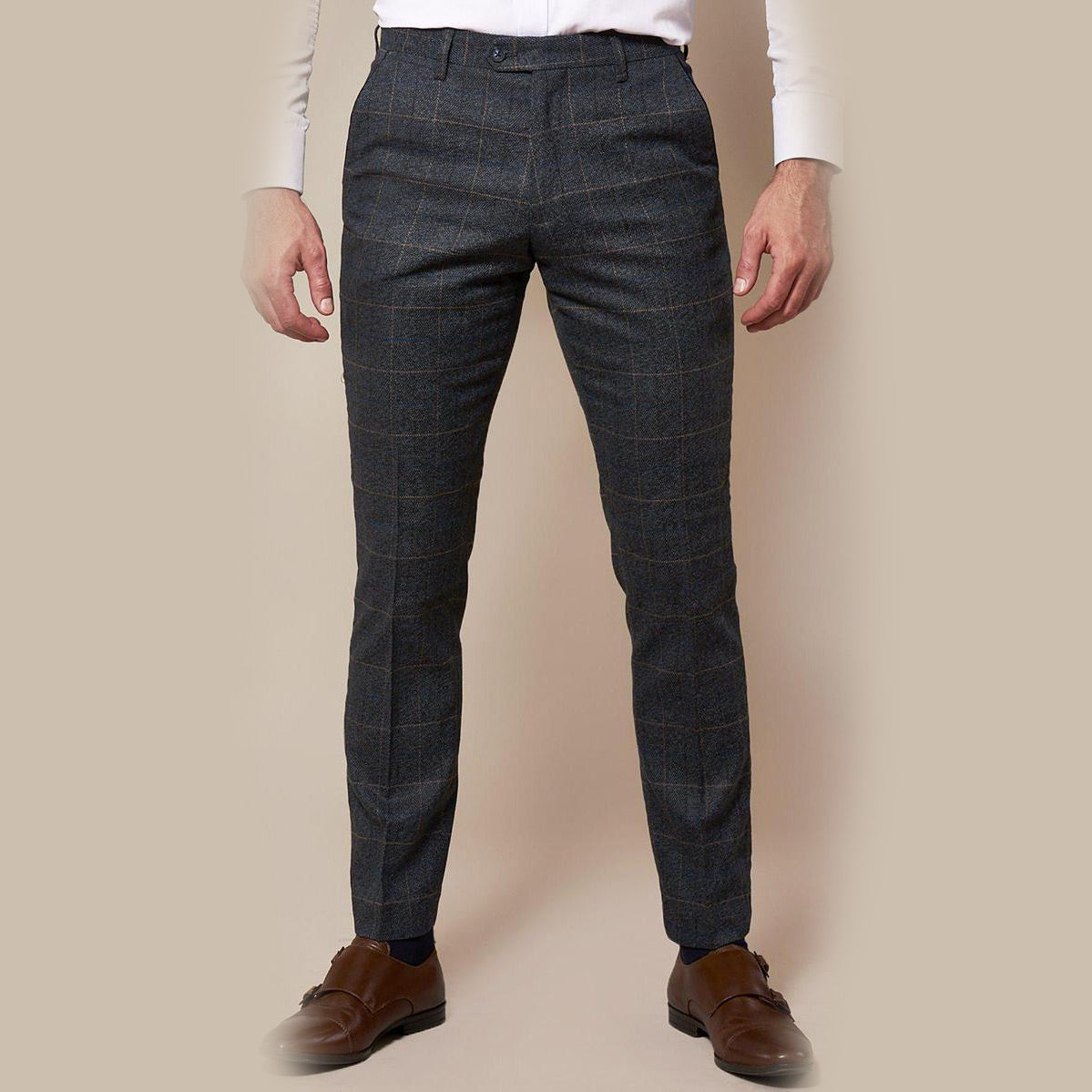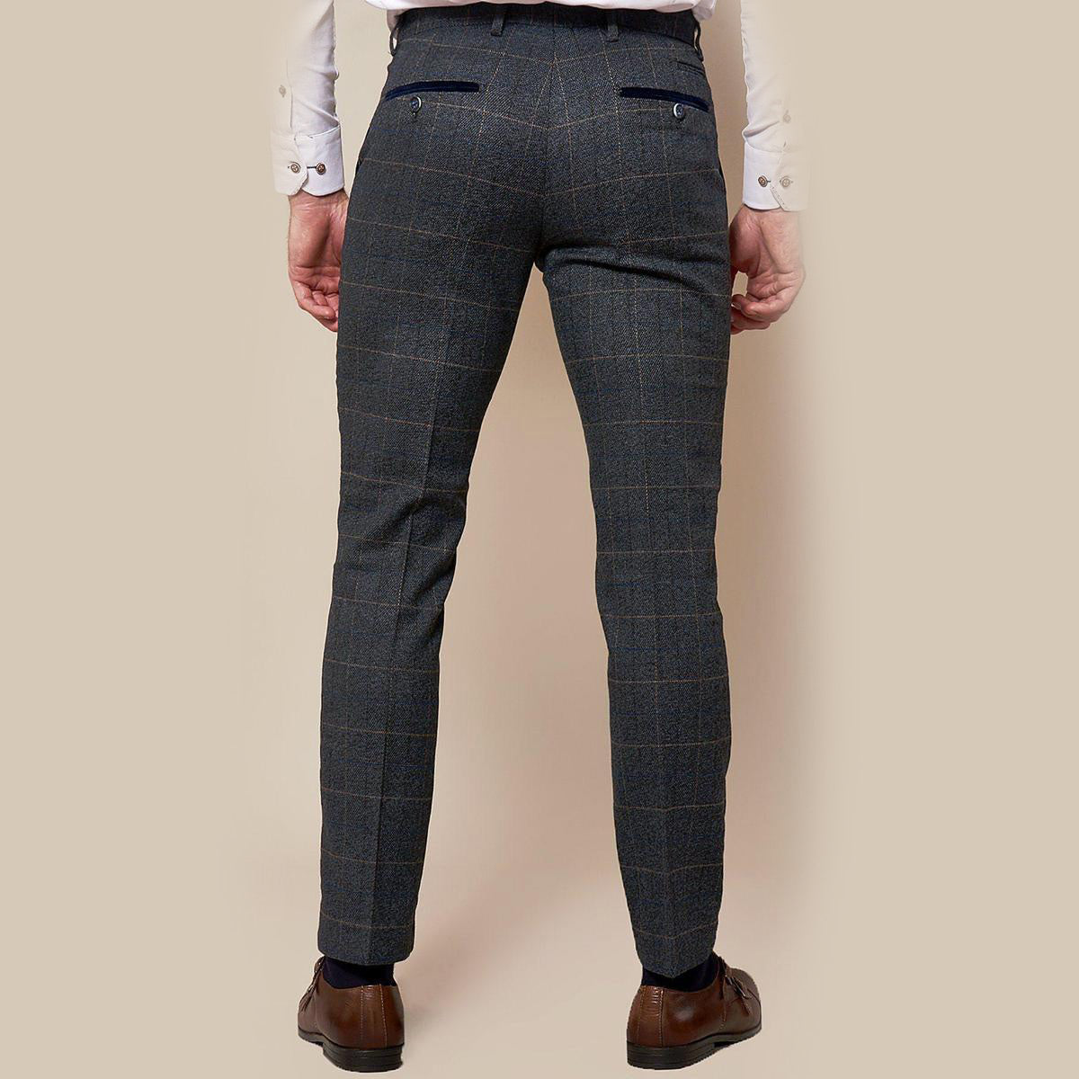 Spruce up in the Scott trousers. These vintage inspired trousers draw inspiration from old age country tweeds featuring a subtle check laid upon a durable heavyweight fabric. Character is added with the navy velvet contrast pocket trims and contemporary slim fitting. Complete with zip fly fastening and functional pockets to the front and reverse.